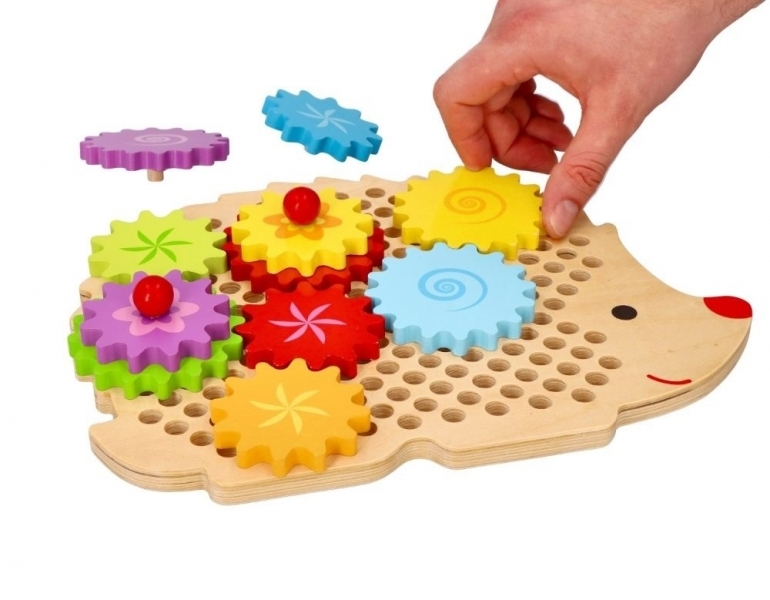 JEŽEK S OZUBENÝMI KOLY. Barevná dřevěná ozubená kola lze naskládat a uspořádat mnoha různými způsoby, aby se navzájem točily. Některá ozubená kola mají otvor pro rukojeť pro snazší přesun větší soupravy. Pokud jsou dobře uspořádány, otočením jednoho kola se posune více prvků. Sada obsahuje:-...