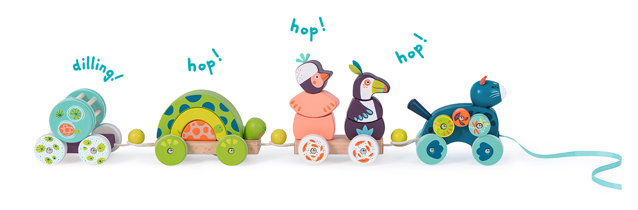Krásný malovaný vláček se zvířátky, která můžete navíc různě poskládat. Vláček vede modrý panter s otáčivými kolečky, následuje ptačí vagón se skládacími figurkami, skládací želvička a poslední vagonek veze točící a chrastící kuželík. przeczytaj całość