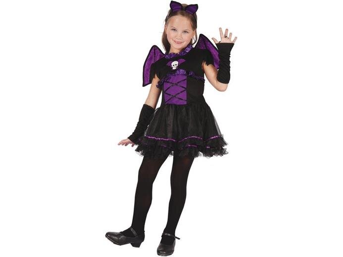 Tento karnevalový kostým promění vaši holčičku na netopýří královnu. Dívčí oblek obsahuje korunku a fialovo-černé šaty. Skvěle se hodí na dětské párty, oslavy, karnevaly, maškarní plesy, Halloween nebo na dětské fotografování. Kostým neobsahuje boty a punčocháče, takže si můžete tyto doplňky zvolit/vyrobit podle vlastní fantazie. Kostým brušky je vhodný pro děti ve věku od 4 do 6 let s výškou 110 až 120 cm.