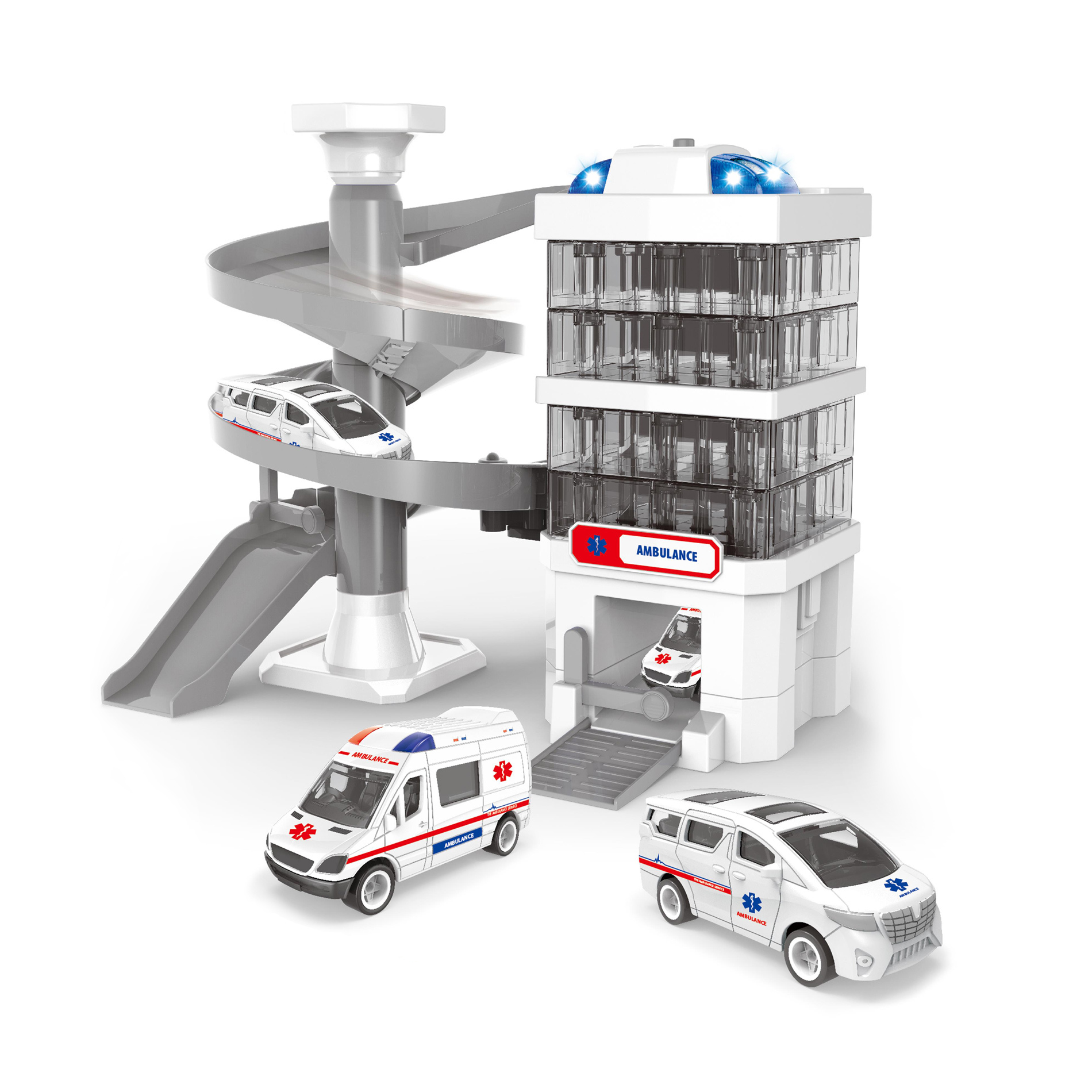Nemocniční patrová budova se sjezdem. Střecha budovy disponuje majáčkem, který po zapnutí vydává reálné zvuky a bliká. K této funci je potřeba použítí 3 ks baterií typu LR44, které jsou uvnitř výrobku. Součástí této sady jsou 2 autíčka ambulance ve velikosti 7,5 cm. przeczytaj całość