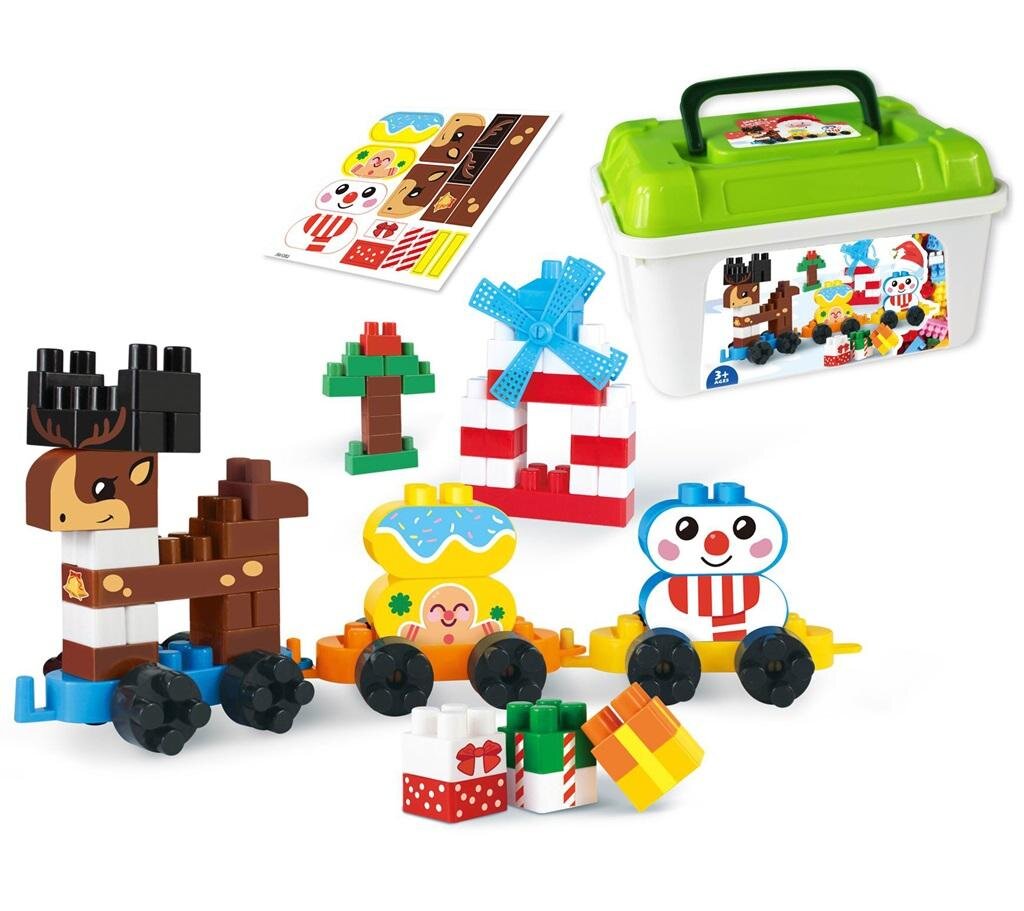 Zestaw klocków z którego można zbudować motywy świąteczne zawierający 82 elementy zapakowany w walizkę. przeczytaj całość