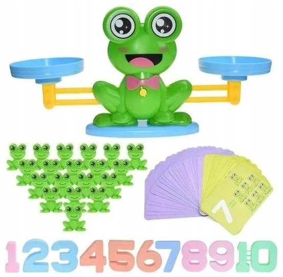 GRA ŻABA BALANSUJĄCA +CYFRY ZABAWKA EDUKACYJNA KARTON pak 36/18 w pudełku: żaba-waga, żabki-odważniki, 10 cyferek, karty wymiary pudełka: 26,5 x 26,5 x 7,5 cm przeczytaj całość