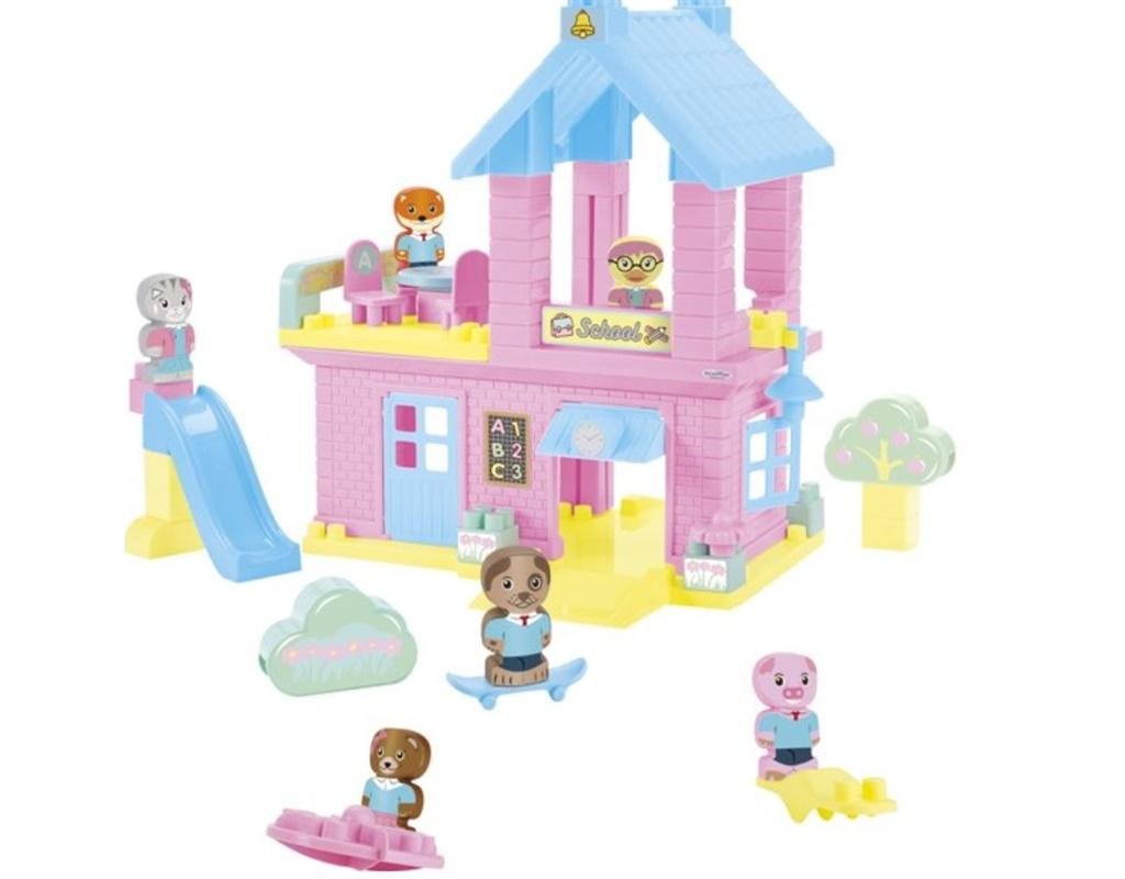Piętrowa, pastelowa szkoła z mnóstwem miejsca do zabawy, w tym zjeżdżalnia karuzela, huśtawka, taras ze stolikiem i krzesełkami. Zestaw zawiera 6 figurek, Wymiary: 33,5x30x35,5 cm, 18m+ przeczytaj całość