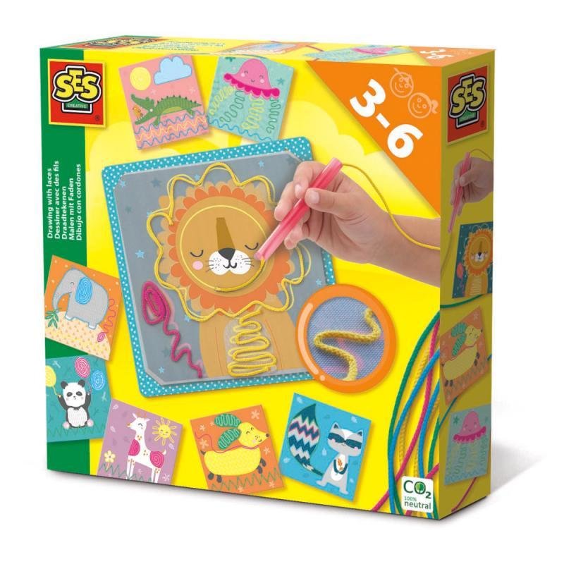 Probuďte tyto roztomilá zvířátka k životu. Barevnými tkaničkami postupně propojujte jednotlivé části pomocí kreslícího pera. Až budete mít hotovo, můžete tkaničky snadno sejmout z kreslící desky a začít malovat znovu. Sada obsahuje: podkladové prkno na suchý zip, 8 předtištěných karet, 12 tkaniček ve 4 barvách, kreslící pero. Rozměr balení: 20 x 20 x 4 cm. Věk: 3+