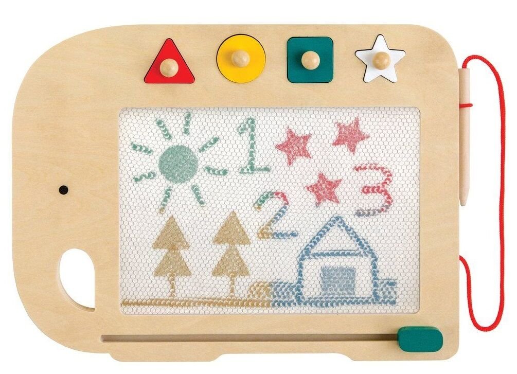 Ta designerska drewniana tablica oferuje dużą powierzchnię do rysowania, na której można malować lub pisać dołączoną ołówkiem na sznurku. Dla zwiększenia kreatywności zawiera także cztery kolorowe magnetyczne stemple (trójkąt, koło, kwadrat, gwiazda), które można dowolnie przemieszczać i tworzyć różne wzory oraz kształty. Dzięki magnesom stemple zawsze pozostają na swoim miejscu, co ułatwia przyciąganie i łączenie form.