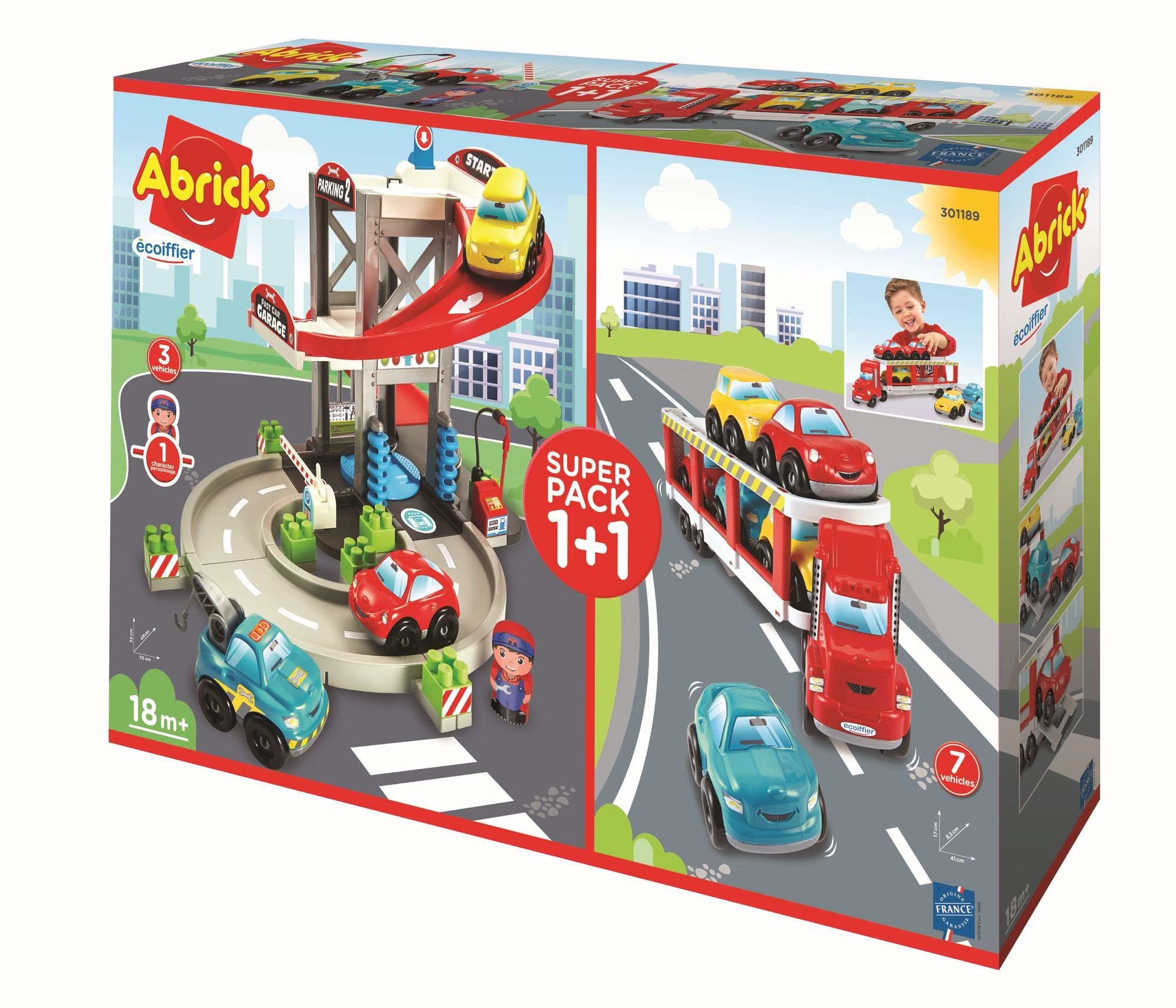 Patrová garáž z řady Abrick pro nejmenší má malou dílnu, čerpací stanici a myčku aut. Součástí je také figurka mechanika, dvě sportovní autíčka, autíčko odtahové služby a další příslušenství. Rozměry (DxŠxV): 55 x 48 x 33 cm. Součástí je také transportér z řady Abrick pro přepravu 6 osobních aut má sklopnou rampu, přes kterou lze auta nakládat a vykládat. Včetně šesti barevných autiček. Rozměry (DxŠxV): 41 x 8,5 x 17 cm.