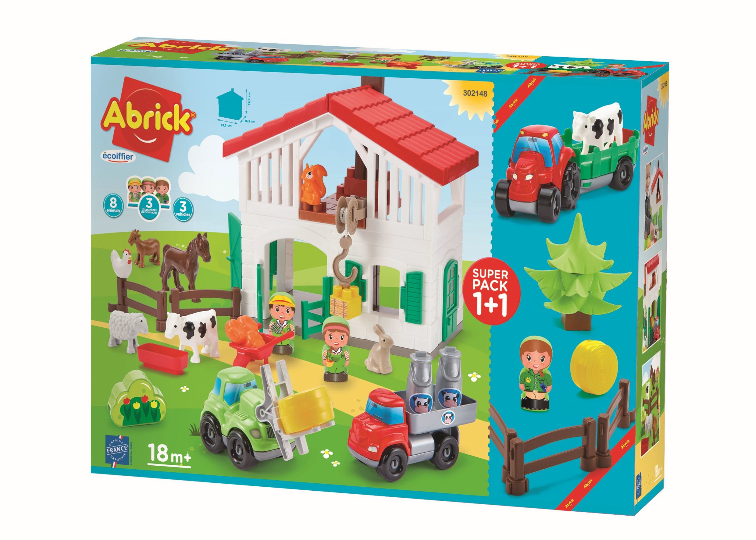 Ve dvoupodlažním statku Abrick žije spousta zvířat. Ve stodole žijí společně krávy, kozy, koně, ovce a kuřata. Během dne se mohou společně pást na pastvině, kterou lze oddělit ploty. Brány statku lze otevřít, aby vysokozdvižný vozík mohl vyložit balíky sena přímo do stáje. Traktory s přívěsy dělají na farmě všechnu důležitou práci. Vůz odváží mléko. Rozměry produktu (DxŠxV): 29,5 x 16,5 x 29,5 cm.