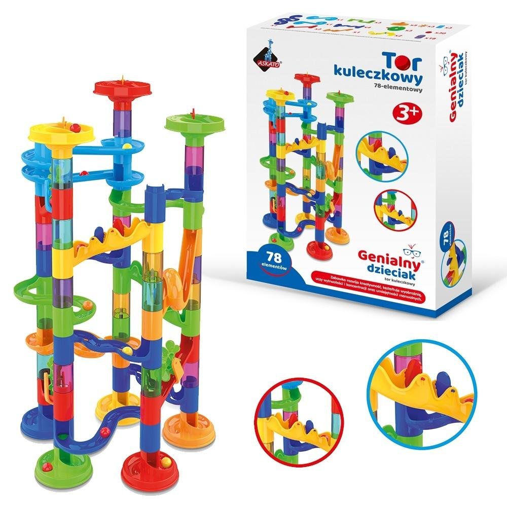 Tor kuleczkowy - 78 elementów48 elem. toru + 30 kolorowych kulekZestaw, który składa się z kolorowych i niełamliwych części oraz plastikowych kuleczek, dzięki któremu można tworzyć super trasy.Dodatkowo zestaw wyposażony jest w przeźroczyste elementy dzięki którym dziecko widzi kulki przelatujące...