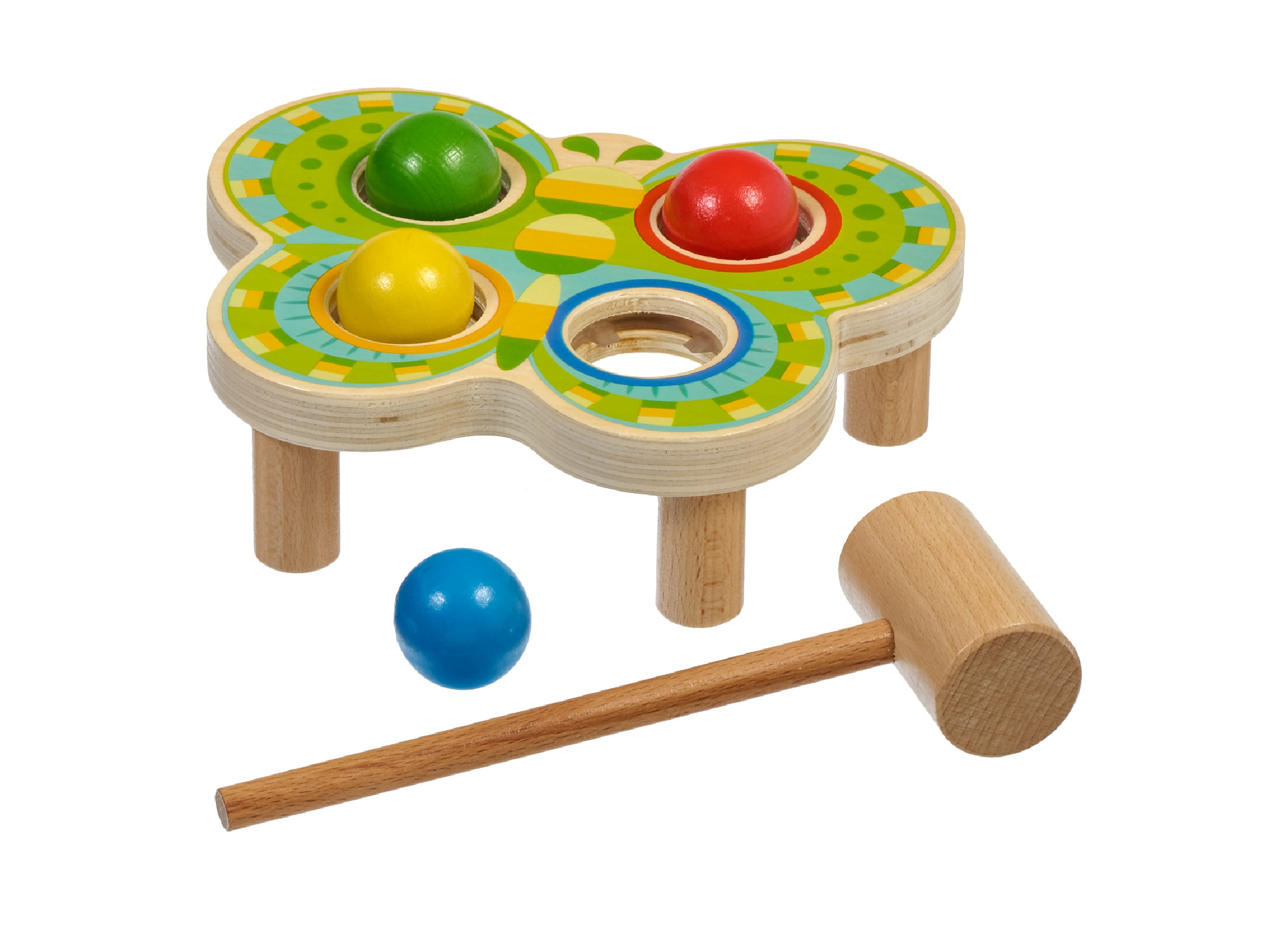 Motýl je designově netradiční dřevěná zatloukačka ve tvaru krásného barevného motýla se 4 barevnými koulemi, která zdobí jeho křídla. Je to zábavná hra, při níž děti kladívkem udeří do barevných koulí a ty následně propadnou do otvorů odpovídající barvy. Hračka slouží k rozvoji jemné motoriky,...