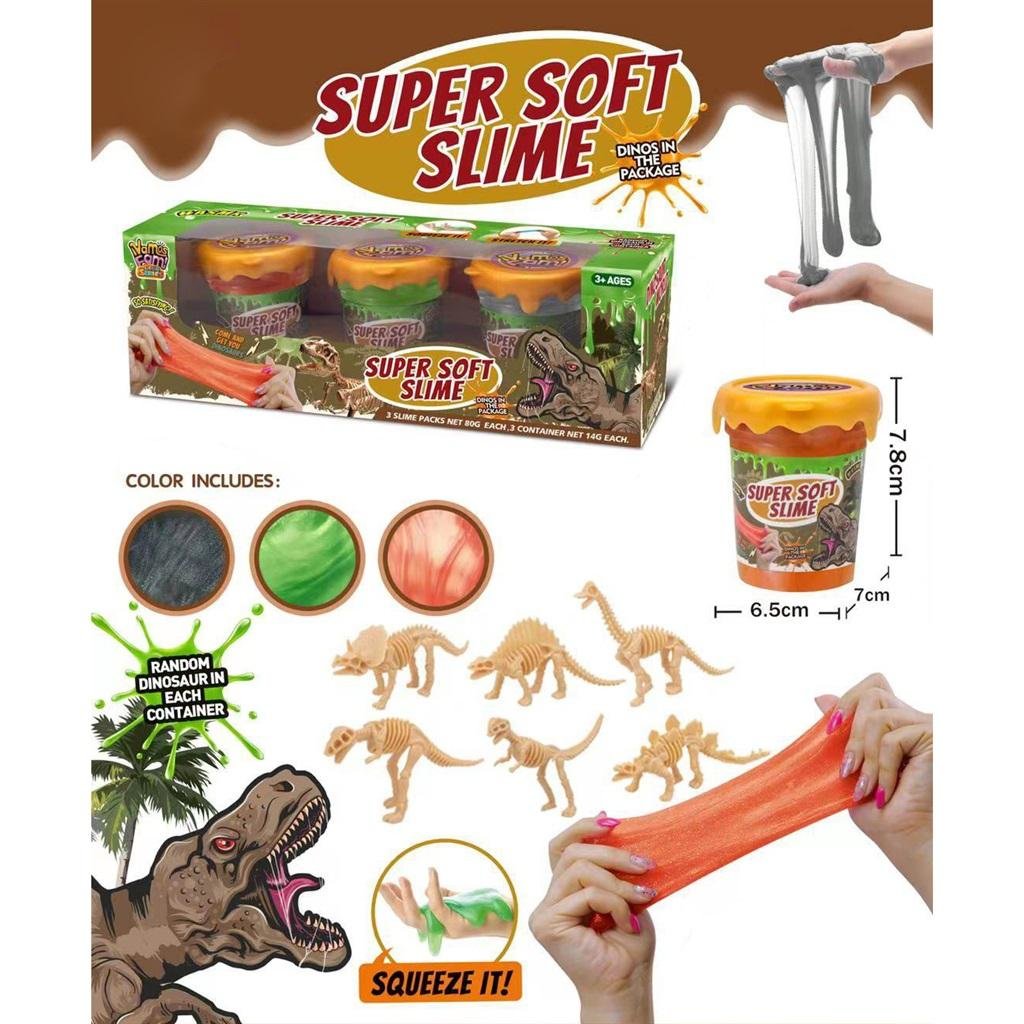 Zestaw trzech kolorowych, rozciągliwych mas magicznych z zatopionymi w nich figurkami szkieletów dinozaurów. przeczytaj całość