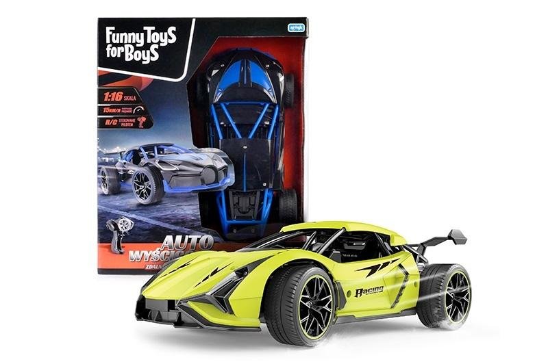 Miks wzorów, towar wysyłany losowo. Cena za sztukę. 2 kolory: żółty, niebieski.Auto wyścigowe zdalnie sterowane.W zestawie: auto 27 cm., pilot, ładowarka, funkcje: pełen zakres jazdy, ustawianie zbieżności kół, amortyzatory, prędkość do 15 km/h, zasięg 10 m.Baterie: 2 x AA 1,5V (brak w zestawie). przeczytaj całość