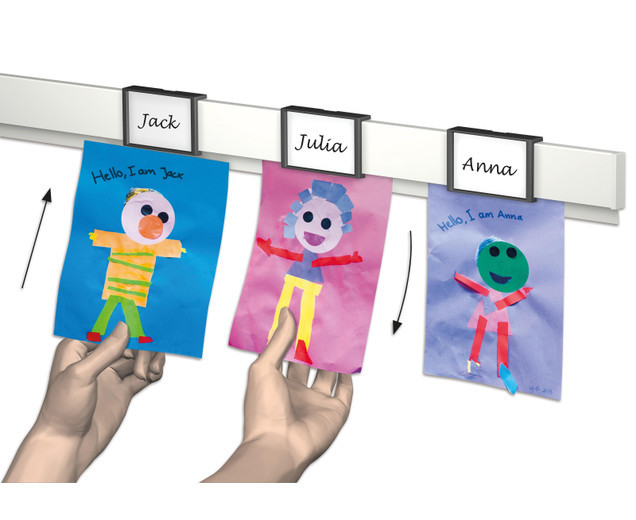 Se závěsným systémem je snadná manipulace. Obrázek či leták vlož zespodu do kolejnice a je hotovo. Vhodné pro zavěšení na zeď.Nástěnný držák může být umístěn nad ostatní nebo vedle nich.Součástí každé kolejnice je montážní materiál.Vhodné do škol, školek, volnočasových zařízení.Obsahuje:kolejnici...