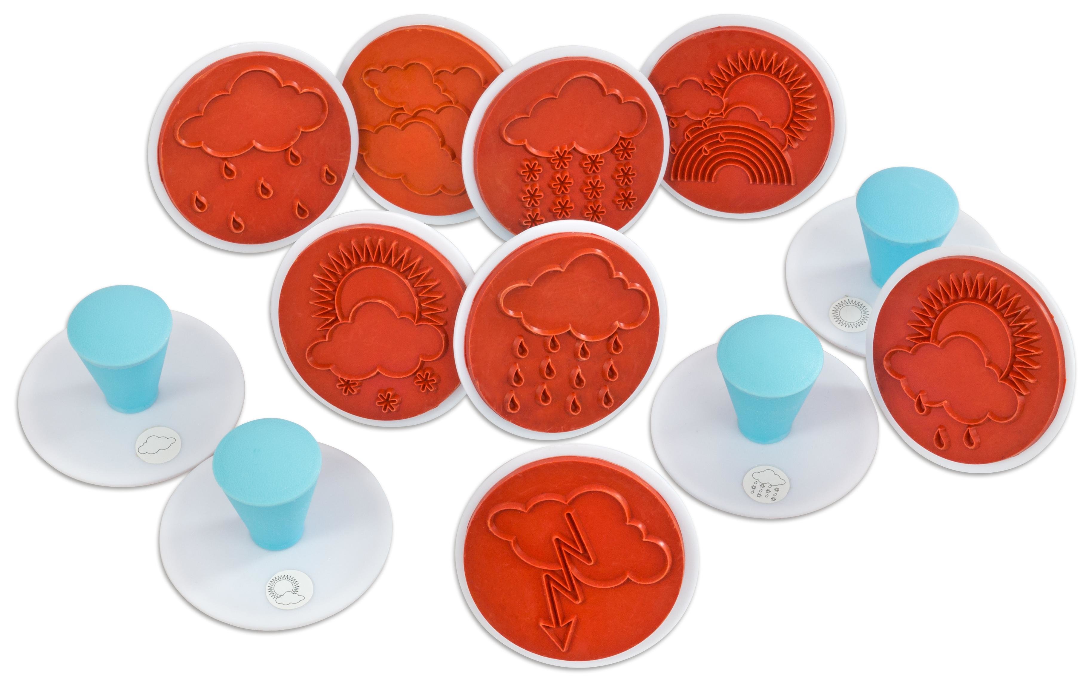 Set velkých dětských razítek umožňuje zaznamenávat skutečné počasí i vytvářet meteorologickou předpověď na další den dle přání dětí. Děti se prostřednictvím razítek seznámí s przeczytaj całość