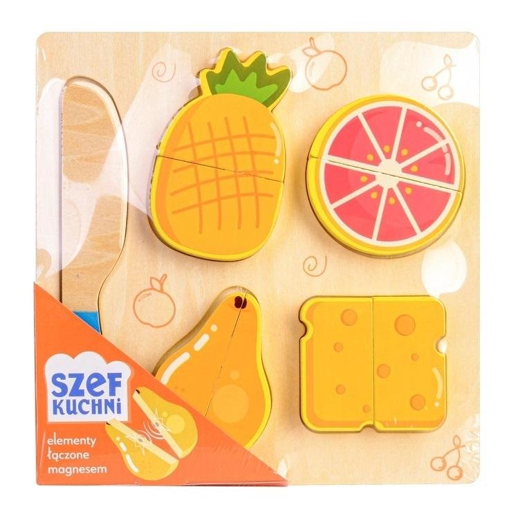 Zestaw "Szef kuchni" rozwija wyobraźnię, kreatywność oraz motorykę dziecka. Zabawa zestawem daje możliwość poznania owoców, warzyw i przekąsek, zachęca do gotowania oraz nauki o zdrowym odżywianiu. Wszystkie elementy wykonane są z drewna, pokryte bezpieczną dla dzieci farbą. Elementy połączone... przeczytaj całość
