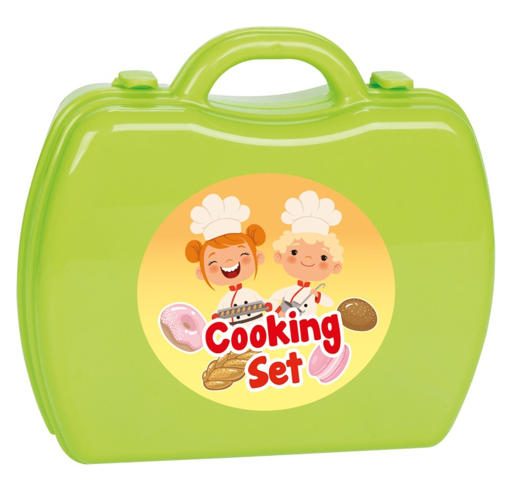 Kuferek kuchenny - zawiera wyposażenie - talerze, sztućce, garnki, kubeczki, plastikowe jedzenie. Łatwy do rozłożenia i przenośny w praktycznym kuferku. przeczytaj całość