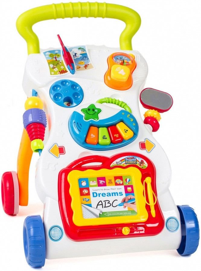 Dětské multifunkční chodítko Huanger 2v1 Music Walker pro ty nejmenší děti, edukační centrum. Je vyrobeno ve tvaru písmene A se dvěmi rameny, které dítěti pomáhá udržet rovnováhu a stabilitu při chůzi. Chodítko je vybaveno knížkou s obrázky, kulatým číselníkem na vytáčení čísel, mobilním...