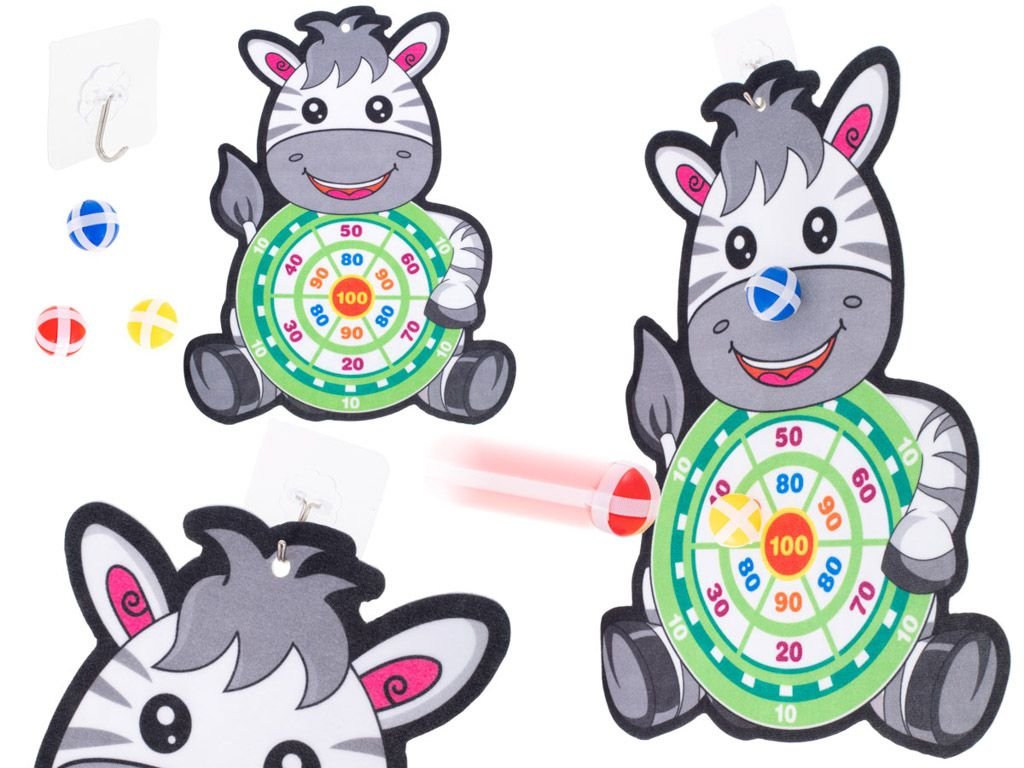 Prosta tarcza z piłeczkami na rzep w kształcie zebry.