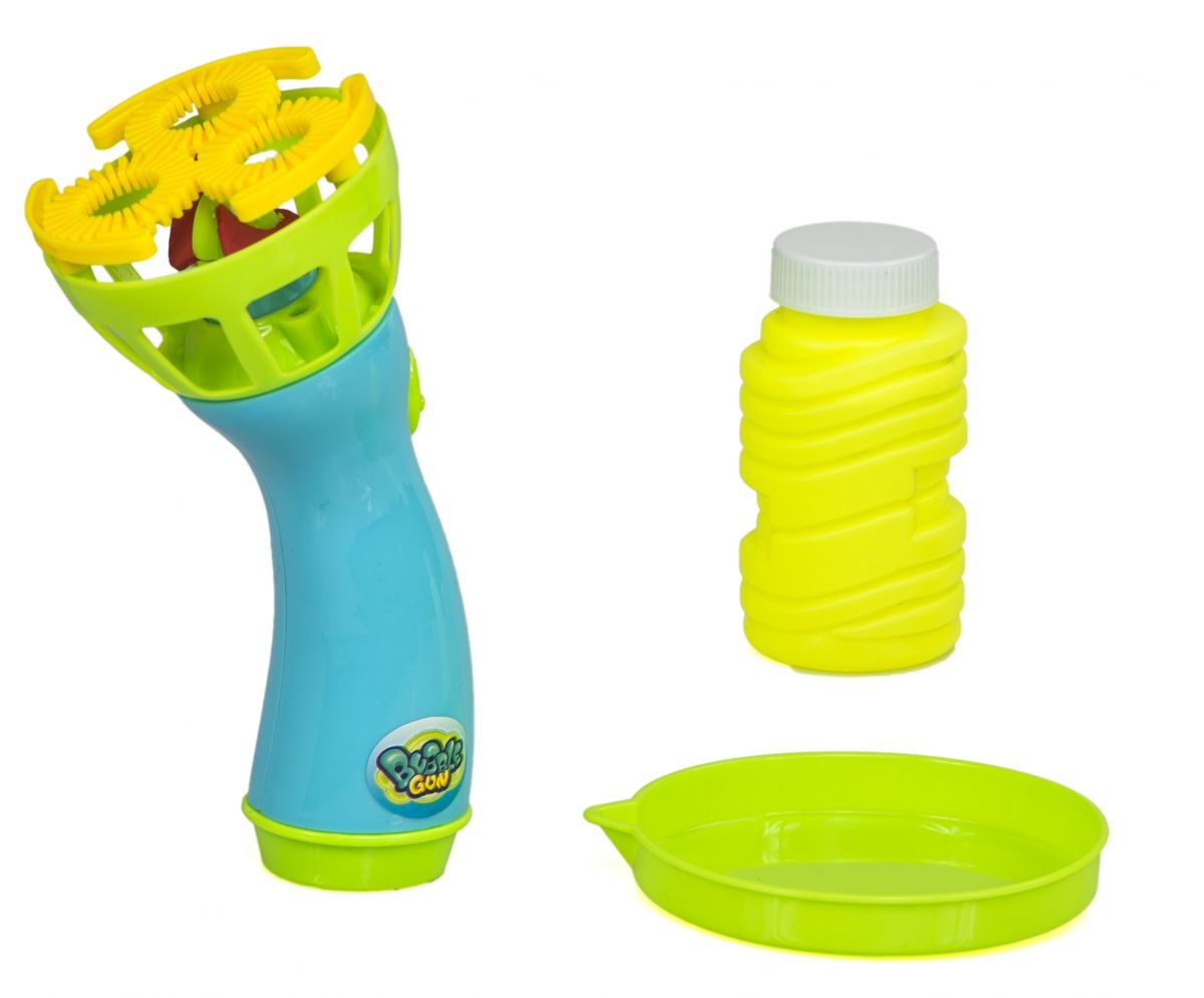 Dětská pistolka chrlící bubliny z bublifuku. Tato hračka je jako stvořená pro venkovní hrátky. Stačí nalít bublifuk do talíře, namočit pistolku a pak už se jen kochat obrovskými i menšími bublinami.