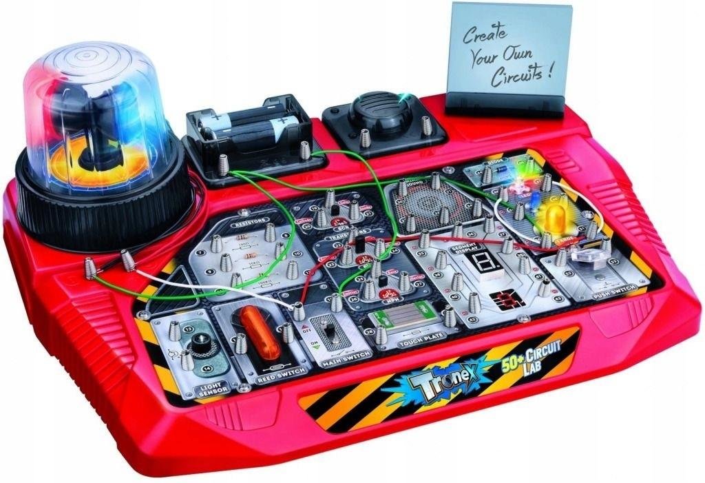 Dowiedz się w jaki sposób działają obwody elektryczne, poprzez praktyczne doświadczenia! Ten duży zestaw pozwoli na przetestowanie aż 50. różnych połączeń, które w inny sposób oddziałują na cały układ. Baw się na trzy sposoby, poznając zależności magnetyczne, sterując oświetleniem i kontrolując styki. W zależności od zastosowanych połączeń uzyskasz inną reakcję, wywołując np. odgłos zwierzęcia, zapalając lampkę LED lub uruchamiając wirujące diody.