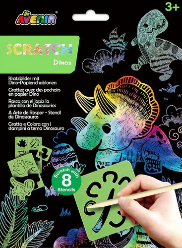 Świetny zestaw kreatywny dla małych dzieci. Ten zabawny zestaw łączy rysowanie przez zdrapywanie ze szablonami. Głównym motywem są dinozaury, dzięki czemu dzieci mogą tworzyć wspaniałe obrazki.