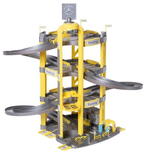 Parking Mercedes 4 poziomy Parking / garaż na licencji Mercedes-Benz z 4 poziomamiParking wielopoziomowy posiada podwójną rampę zjazdową przygotowaną do wyścigów. Zabawka wyposażona jest w 2 tory na 2 małe samochody lub 1 pas zjazdowy dla 1 dużego samochodu. Parking wyposażony jest w windę,... przeczytaj całość