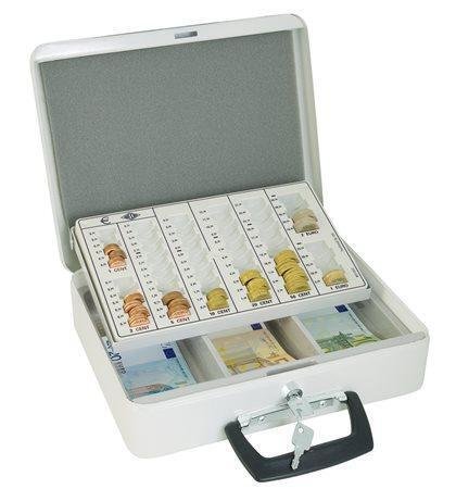 Odolná ocelová pokladnička na eura3 přihrádky na bankovkyKapacita na mince: 125,75 €Vnitřní výplň zabraňuje vysypání při přenosu Bezpečnostní zámek se 2 klíči S rukojetí Rozměry: 31,5 x 24,5 x 9,5 cm Hmotnost: 2,29 kg przeczytaj całość