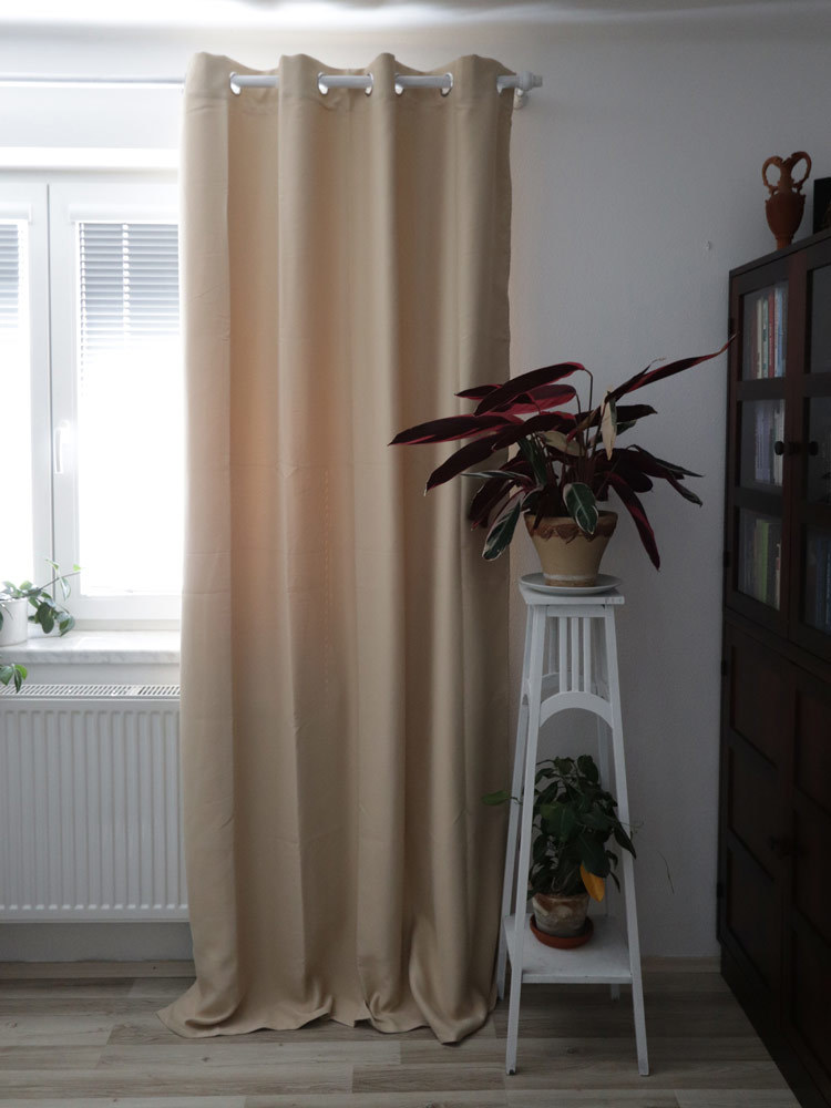 Zatemňovací hotový závěs ve světle kávové barvě. przeczytaj całość