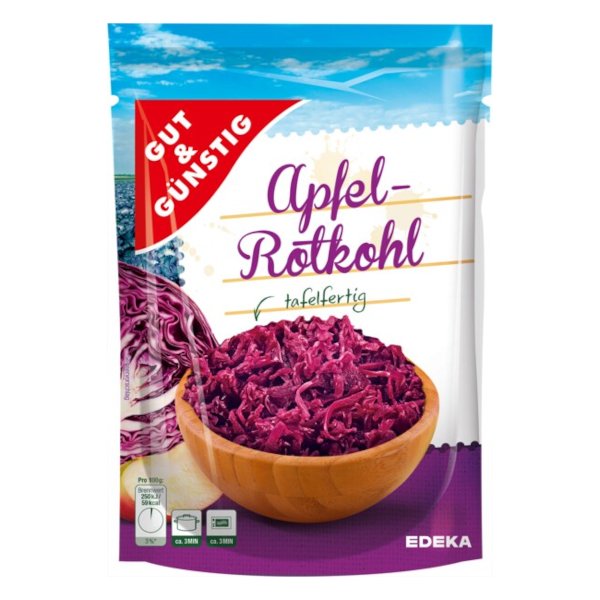 GG Delikatesowa czerwona kapusta z jabłkami 400 g Smaczna czerwona kapusta z jabłkiem pasuje do dań mięsnych lub jako dodatek do kuchni na zimno i na ciepło. Kapusta jest przyprawiona i gotowa do podania od razu lub do dalszej obróbki cieplnej. Świeżo przetworzona z plonów. Bez dodatku substancji... przeczytaj całość