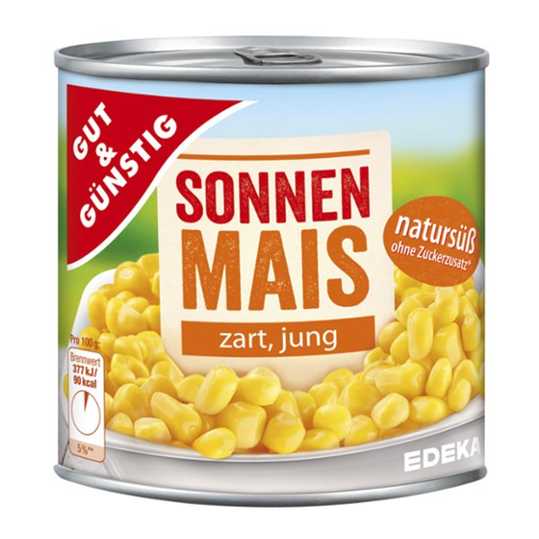 GG Sonnen Mais - mladá kukuřučná zrna obsah 330g , pevný podíl 285gSložení:vařená kukuřice, voda, jedlá sůl. Průměrná výživová hodnota na 100g: Energetická hodnota : 319kJ/76kcal , Tuk: 6,7g - Tuky: 1,6g, z toho nenasycené mastné kyseliny 0,2g ; Sacharidy: 12,1g - z toho cukr:7,1g; Bílkoviny:...