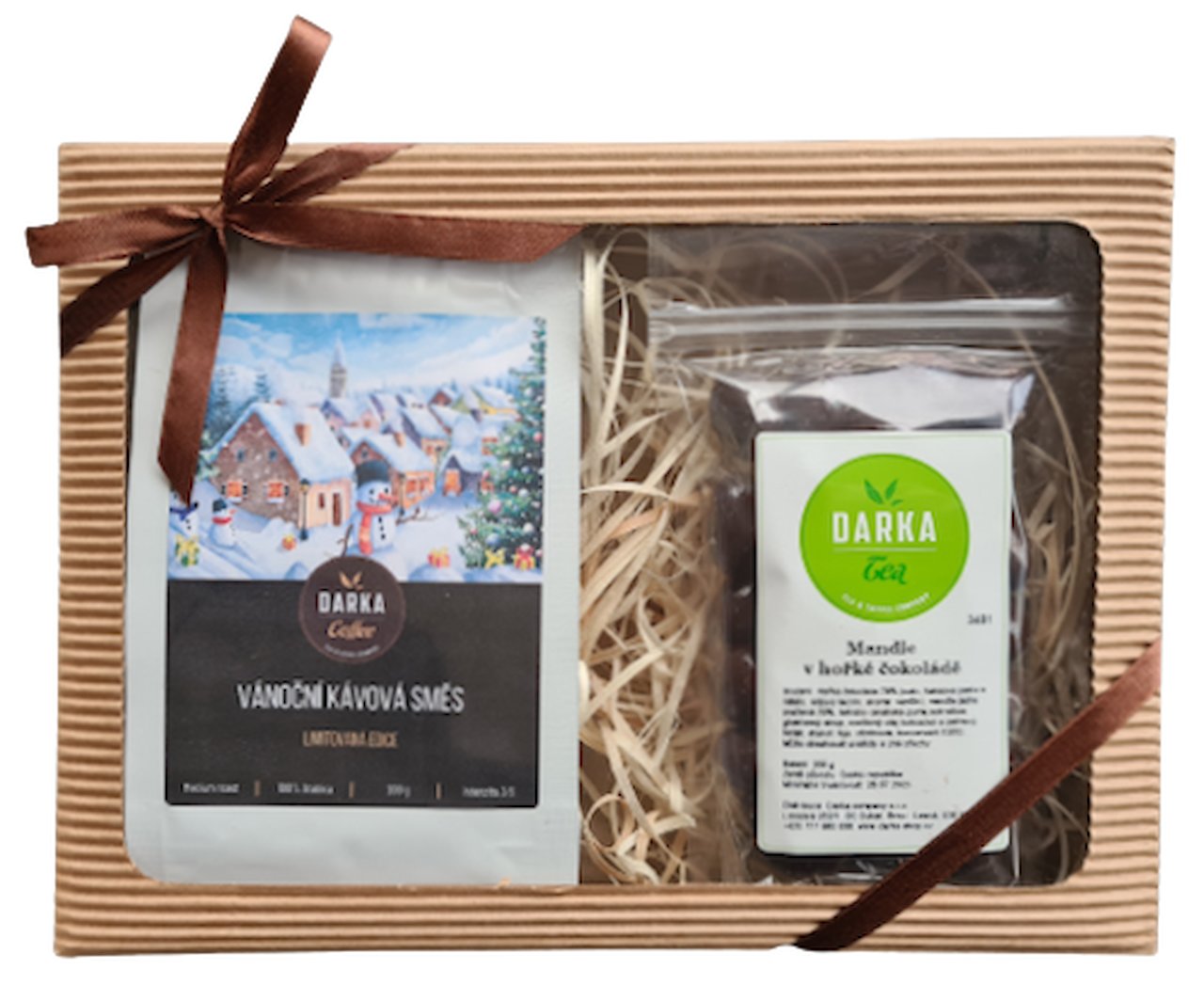 Dárková kazeta Vánoční chvilka: Originální dárková kazeta Vánoční chvilka je určená nejen ženám ale také mužům v sobě skrývá naprosto delikátní mandle v hořké čokoládě a exkluzivní čerstvě praženou Vánoční kávu arabica v limitované edici. Tímto dárkem ohromíte chuťové smysly, neboť výborná káva s...