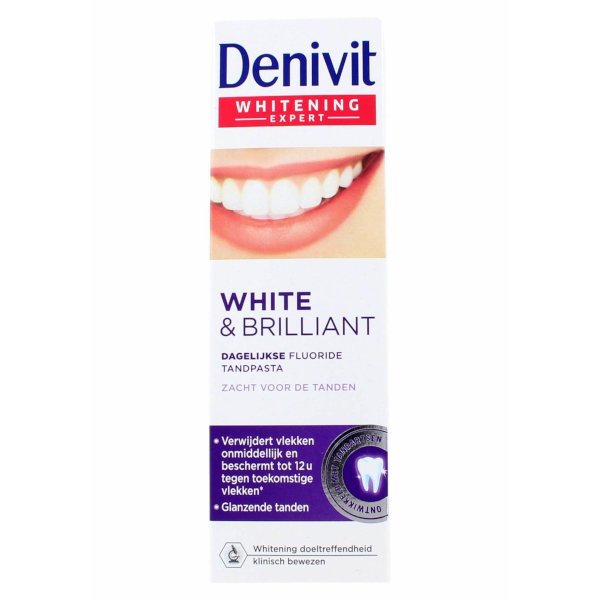 Denivit zubní pasta White & Brilliant - 50 ml Účinně odstraňuje skvrny a chrání před zabarvením zubů po dobu 12 hodin způsobeným jídlem, pitím a tabákem. Obnovuje přirozenou bělost zubů bez poškození zubní skloviny.Používejte tuto zubní pastu alespoň dvakrát denně po dobu 2 až 3 minut. przeczytaj całość