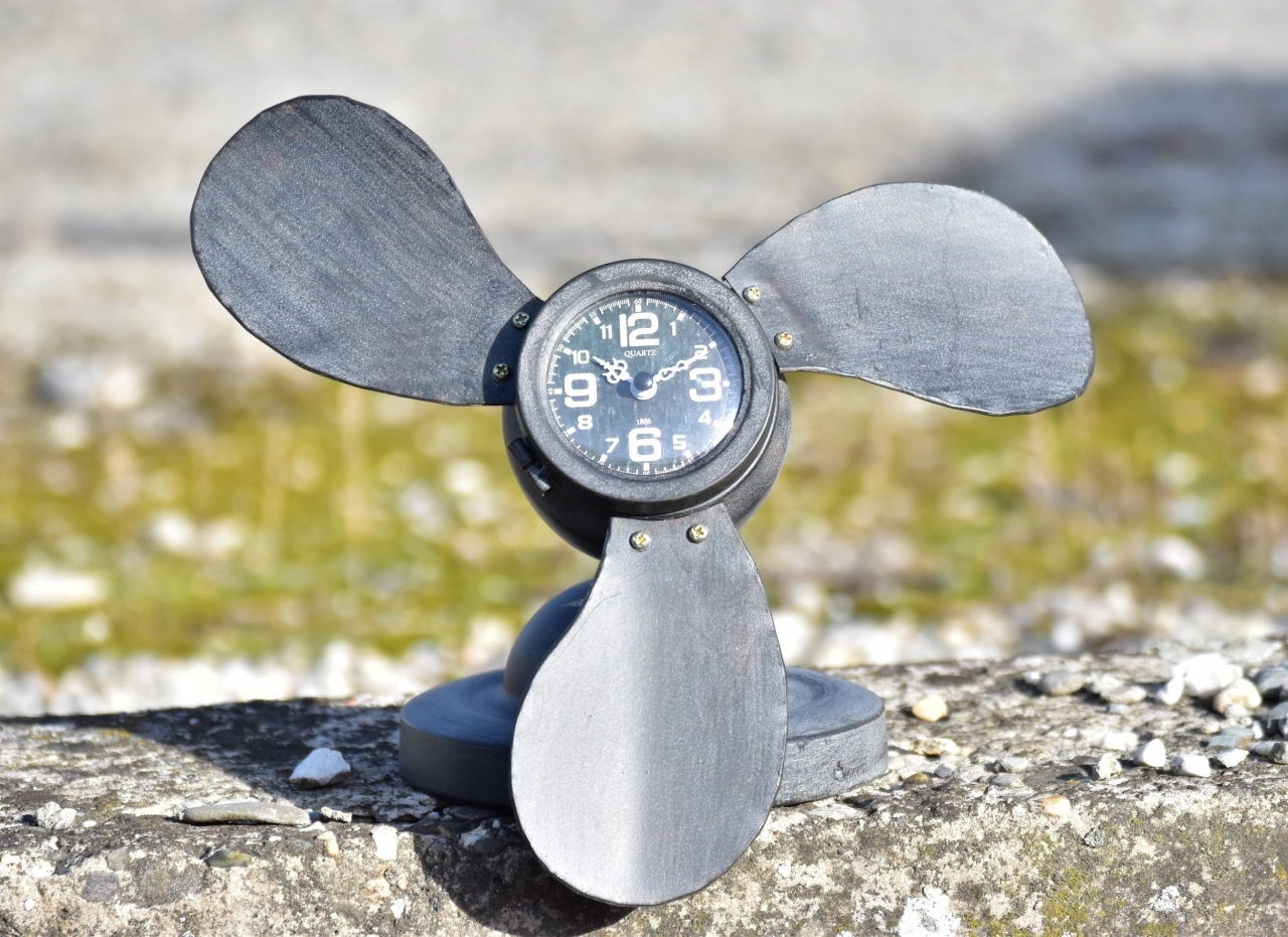 Stylové hodiny industriálního stylu s vrtulí, které potěší nejen každého letce. Mají kovovou konstrukcí k postavení. Hodiny jsou vhodné především do interiéru. Hodinový strojek je napájený 1x baterií AA, která není součástí balení.Materiál: kovRozměry:výška: 27 cmšířka: 27 cmdélka: 32 cm przeczytaj całość