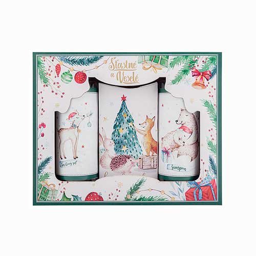 Vánoční kosmetická sada - Štastné a VeseléDárkové balení vánoční kosmetiky - sprchový gel 100 ml, ručně vyráběné mýdlo 100 g a vlasový šampon 100 ml - jablko a skořiceKrémový sprchový gel s olivovým olejem, extrakty z bylin a vůní jablka a skořice 100 ml. Krémový sprchový gel s vůní jablka a...
