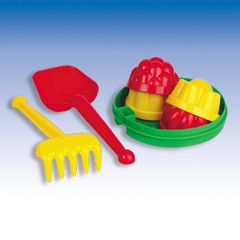 Barevná sada na písek. Lopatka, hrabičky, sítko, 3 druhy báboviček przeczytaj całość