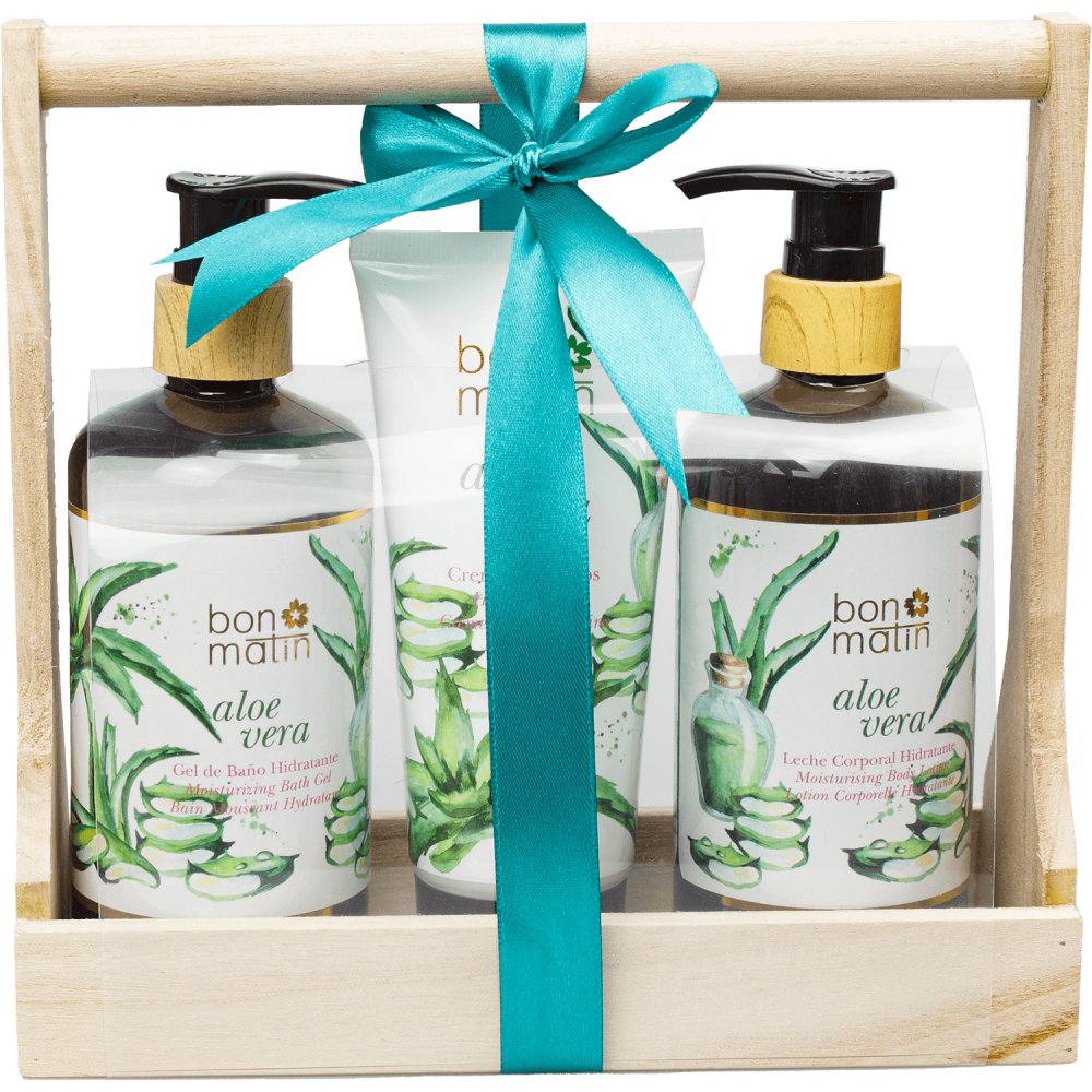 Dárková sada značky Bon Matin aloe vera v dekorativním dřevěném závěsu obsahuje 300 ml hydratační sprchový gel, 300 ml hydratační tělové mléko, 150 ml pleťový krém. przeczytaj całość