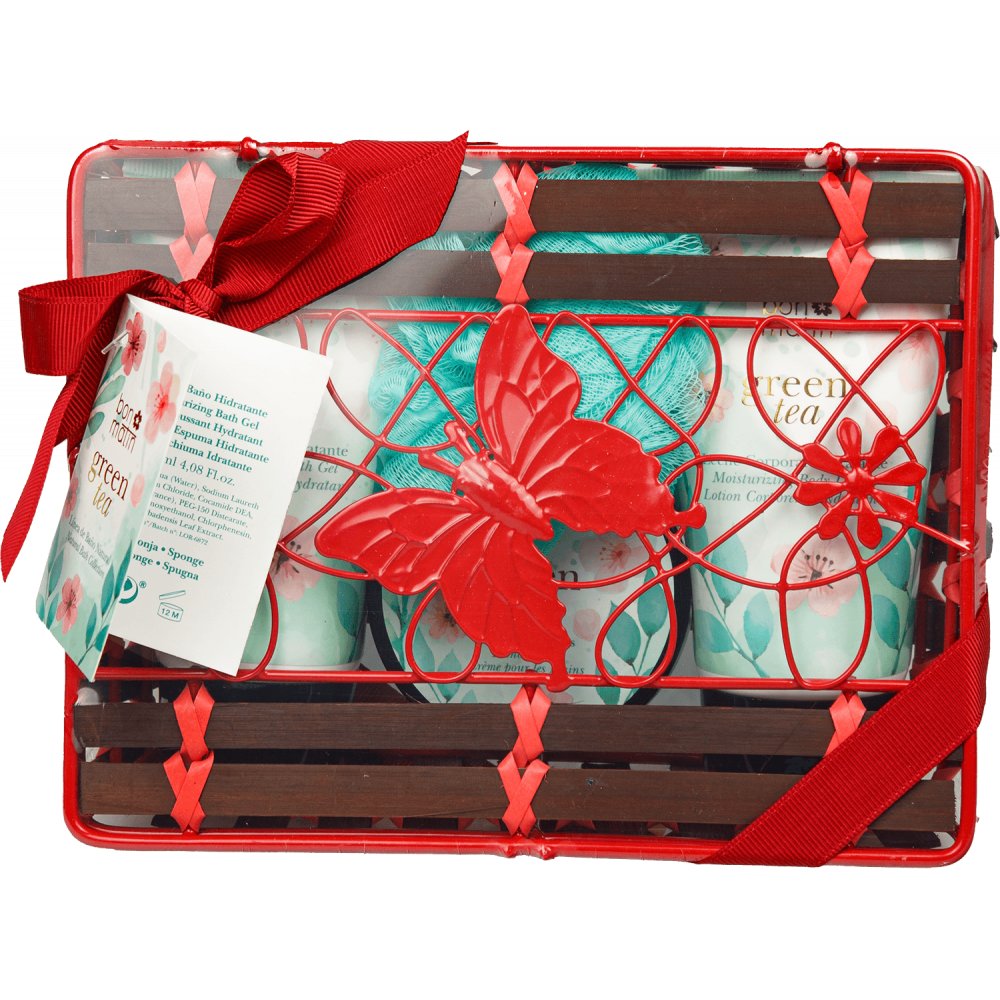 Dárková sada značky Bon Matin green tea v dekorativním kovovém košíku obsahuje 120 ml hydratační sprchový gel, 120 ml hydratační tělové mléko, 50 m pleťový krém a žíňku. przeczytaj całość