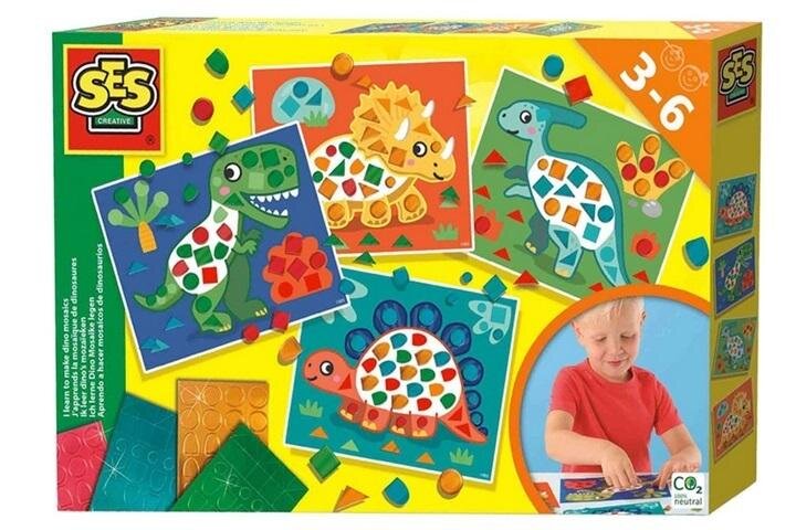 Ten zestaw mozaik stymuluje umiejętności motoryczne małych dzieci, zapewniając popołudniową zabawę. 4 duże karty z motywem dinozaurów można wypełnić fajnymi piankowymi naklejkami w różnych kształtach mozaiki. Naklejki mają również metaliczny efekt i dopełniają dzieła sztuki! Zawartość zestawu: - 4 duże, wstępnie zadrukowane karty z dinozaurami - Różne kształty i kolory metalicznych naklejek mozaikowych