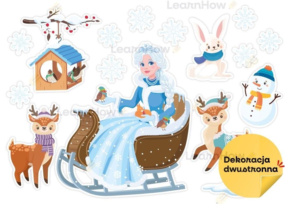 Zestaw zawiera 16 kolorowych elementów w wersji dwustronnej! Idealne na okno!Dekoracje są wycięte, gotowe do powieszenia.Zestaw składa się z dużej postaci Pani Zimy w saniach, 2 reniferów, bałwanka, zajączka, karmnika na gałęzi, śnieżnej zaspy oraz 9 śnieżynek.Idealny do zimowej dekoracji szkoły...