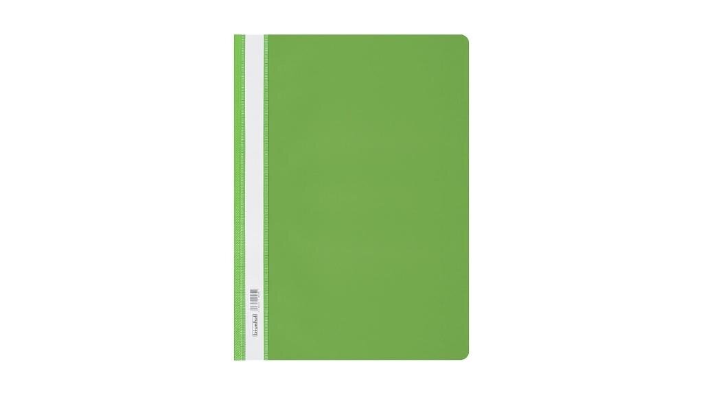Skoroszyt wykonany z twardej folii PVC, przód przezroczysty, tył kolorowy. Wewnątrz klasyczny mechanizm z wąsem i listwą skutecznie zabezpieczający wpiętą zawartość; wąs o długości 16,5 cm. Na bocznej krawędzi wymienny, papierowy pasek do opisu zawartości z kodem kreskowym na szt. Dwa wycięcia...