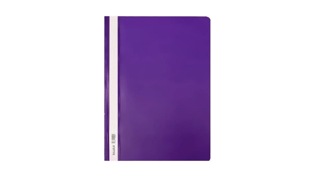 Skoroszyt wykonany z twardej folii PVC, przód przezroczysty, tył kolorowy. Wewnątrz klasyczny mechanizm z wąsem i listwą skutecznie zabezpieczający wpiętą zawartość; wąs o długości 16,5 cm. Na bocznej krawędzi wymienny, papierowy pasek do opisu zawartości z kodem kreskowym na szt. Dwa wycięcia...