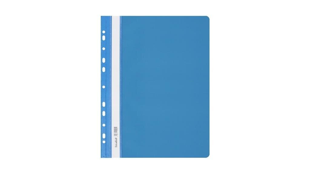 Skoroszyt wykonany z twardej folii PVC, przód przezroczysty, tył kolorowy. Europerforacja umożliwiająca wpięcie do segregatora z dowolnym ringiem. Wewnątrz klasyczny mechanizm z wąsem i listwą skutecznie zabezpieczający wpiętą zawartość; wąs o długości 16,5 cm. Na bocznej krawędzi wymienny,...