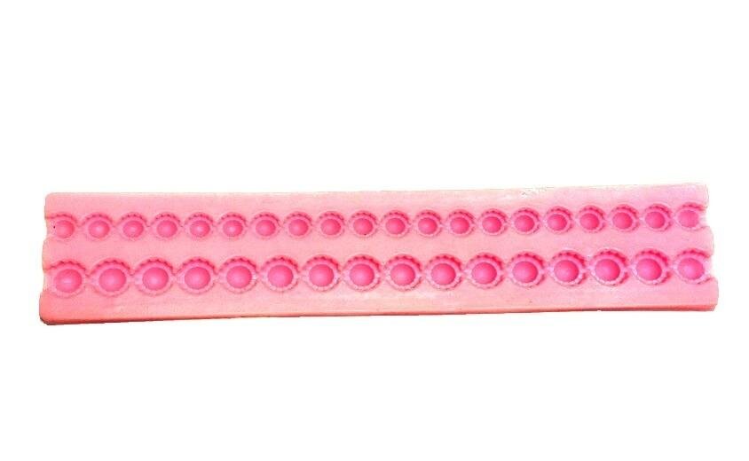 Forma silikonowa wielkości 19 cm x 4 cm do odlewów z gipsu, mas plastycznych, plasteliny, modeliny, mas cukierniczych itp.Z formy jest możliwość odlania lub stworzenia 2 elementów w kształcie bordiury z kryształków-klejnocików. przeczytaj całość