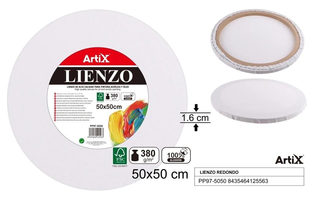 Wysokiej jakości okrągłe płótno o gramaturze 380 g/m2 wykonane w 100% z bawełny, doskonale naciągnięte i zszyte do drewnianej ramy o grubości1,6 cm. Nadaje się do malowania olejnego i akrylowego.Rozmiar: 50 cm przeczytaj całość