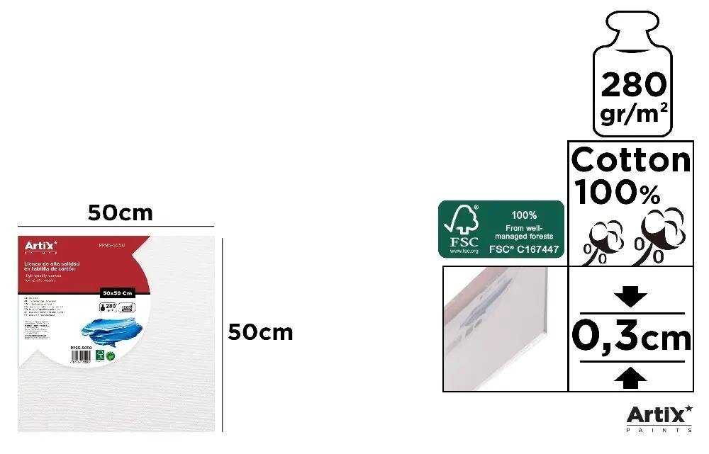 Mini płótno z drewnianą sztalugą. Płótno o gramaturze280 g/m2 wykonane w 100% z bawełny. Rozciągnięte na drewnianej ramie i zszyty dla lepszego mocowania. Wskazane do malowania olejnego i akrylowego.Wymiary: 50 x 50 cm. przeczytaj całość