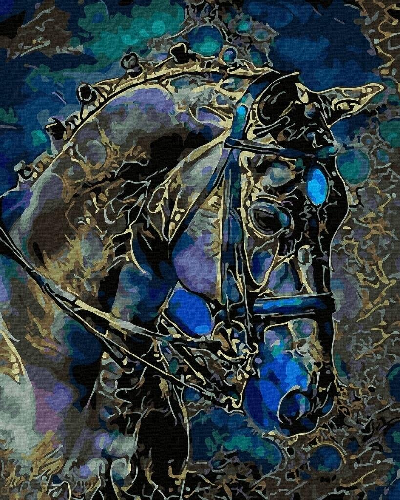 Elegancka i pełna detali głowa konia w złoto-niebieskiej stylistyce. Obraz idealny dla miłośników koni i majestatycznych stworzeń.Poziom trudności: średni.Wymiary: 40x50 cm.Zawiera: płótno na ramie, ponumerowane farby akrylowe, zestaw pędzli. przeczytaj całość
