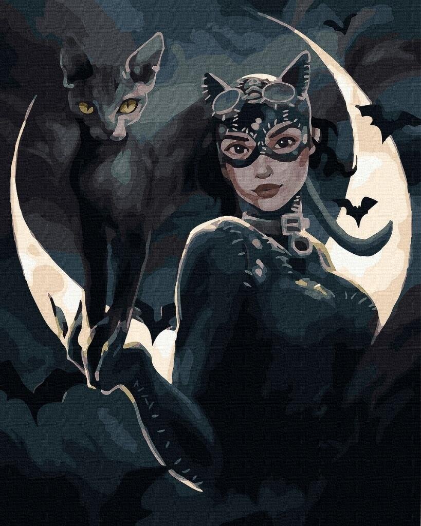 Tajemnicza kobieta w masce kotki w towarzystwie czarnego kota i nietoperzy. Obraz z charakterem i siłą dla tych, którzy lubią ciemny klimat i odrobinę rebelii.Poziom trudności: średni.Wymiary: 40x50 cm.Zawiera: płótno na ramie, ponumerowane farby akrylowe, zestaw pędzli. przeczytaj całość