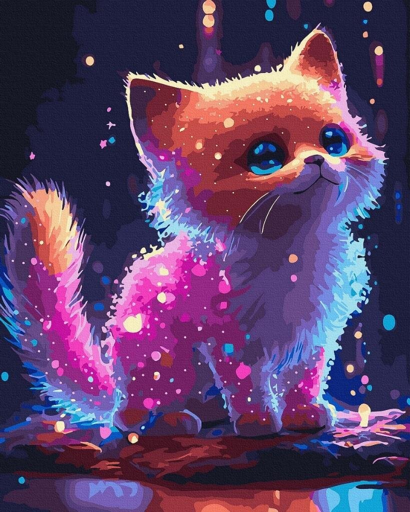 Uroczy kotek w neonowych kolorach, jakby pochodził z innej planety. Idealny wybór dla dzieci i wszystkich, którzy kochają słodycz i kolory.Poziom trudności: średni.Wymiary: 40x50 cm.Zawiera: płótno na ramie, ponumerowane farby akrylowe, zestaw pędzli. przeczytaj całość