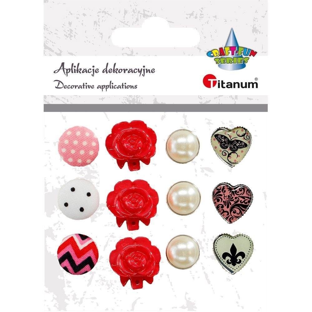 Ćwieki 12szt. 4 wzory x 3 szt.: okrągłe z materiału 14mm, róże 17mm, perła w metalu 13mm, serce 15x15mm przeczytaj całość