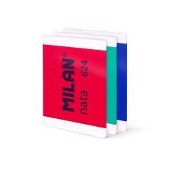 Zestaw 3 zeszytów notesów klejonych A4, papier gładki, 48 kartek. Kolory: niebieski, zielony i różowy. Elastyczna kartonowa okładka w dwóch różnych wykończeniach - błyszczącym i matowym. Wysokiej jakości papier o gramaturze 95 gr/m2, mikroperforowany. Kolekcja MILAN nata(R) 624 inspirowana jest oryginalną kolorystyką i designem gumek MILAN produkowanych w Hiszpanii od 1918 roku.