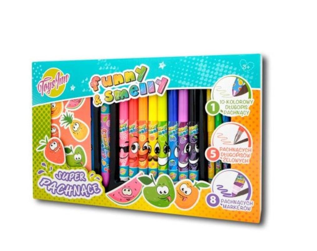 Zestaw pachnący mały zawiera: jeden 10-kolorowy długopis pachnący, 2 arkusze pachnących naklejek, 5 pachnących długoppisów żelowych oraz 8 pachnących markerów.Kolory (zapachy) długopisów żelowych: żółty (banan), zielony (jabłko), niebieski (jagoda), różowy (arbuz) i czerwony (truskawka).Kolory...